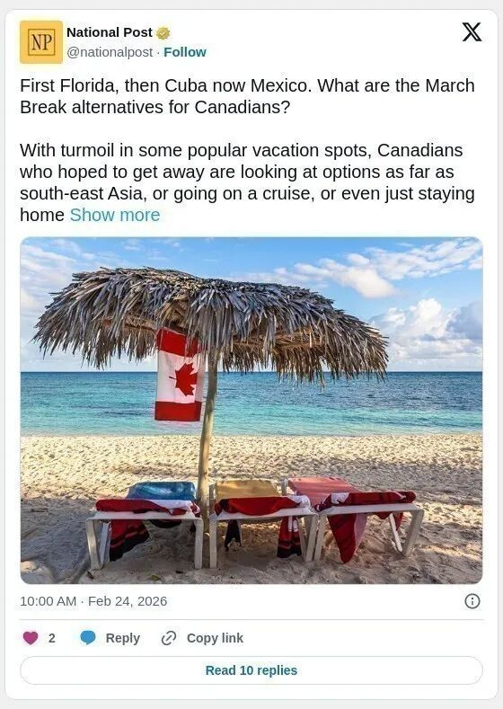 此前,由于美国对古巴的燃油限制措施,加拿大航空宣布2月10日至4月底暂停所有飞往古巴的航班,影响了TripCentral约2,600个预订。随着春假临近,游客寻找替代目的地变得紧张且价格高昂。Vanderlubbe表示:“一旦古巴被取消,大家集中寻找其他目的地,价格瞬间飙升,旅游购买就像参加‘现场拍卖’”。