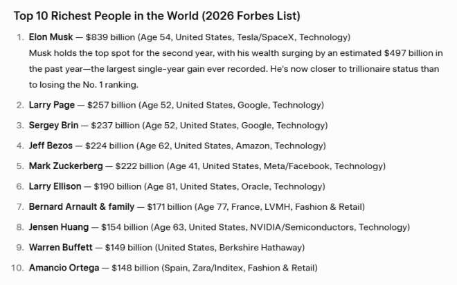 榜单上的“老面孔”依旧在列。特斯拉和SpaceX创始人埃隆·马斯克以高达8390亿美元的净资产位居榜首,几乎是其2025年财富的三倍。