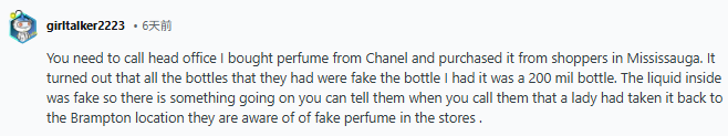 “我之前在密西沙加的Shoppers买过一瓶香奈儿香水,结果发现他们店里所有的香水都有问题。我买的那瓶是200毫升装的,里面的液体明显不对劲,说明店里肯定有问题。”