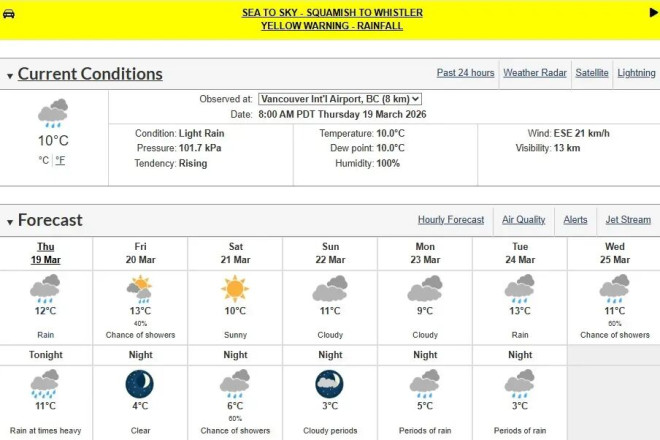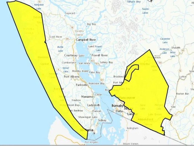 不仅是高贵林,大温、菲沙河谷、海天公路沿线、温哥华岛西部,几乎整个南海岸都在这轮降雨影响范围内。部分地区预计总降雨量同样会逼近甚至超过120毫米。