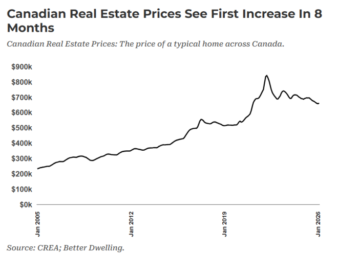 上个月,加拿大房价出现小幅但值得关注的上涨。2月份典型房价上涨0.5%(+3500加元),达到66.13万加元,这是8个月来的首次月度上涨。