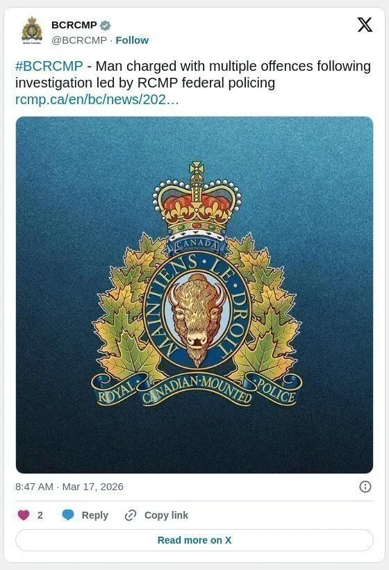 皇家骑警今天表示,经过加拿大皇家骑警联邦警务太平洋地区(FPPR)敏感调查组(SIU)长达四年的调查,一名温哥华男子面临多项指控。