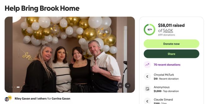 Riley Gavan和Corrina Gavan(分别是Devon Gavan的兄弟和母亲)上周发起了GoFundMe筹款,帮助把Devon的未婚妻Brook Morneau送回位于安省的大萨德伯里。