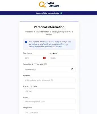 点击链接后,您将进入一个假冒魁北克水电公司网站的页面。系统会提示您点击蓝色按键以验证退款资格。