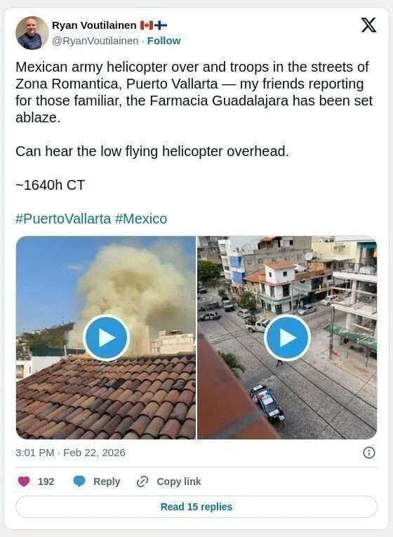 他还在社交媒体上表示:“墨西哥军队的直升机在巴亚尔塔港的浪漫区上空盘旋,士兵们出现在街头”,“能听到头顶上低空飞行的直升机的声音”。