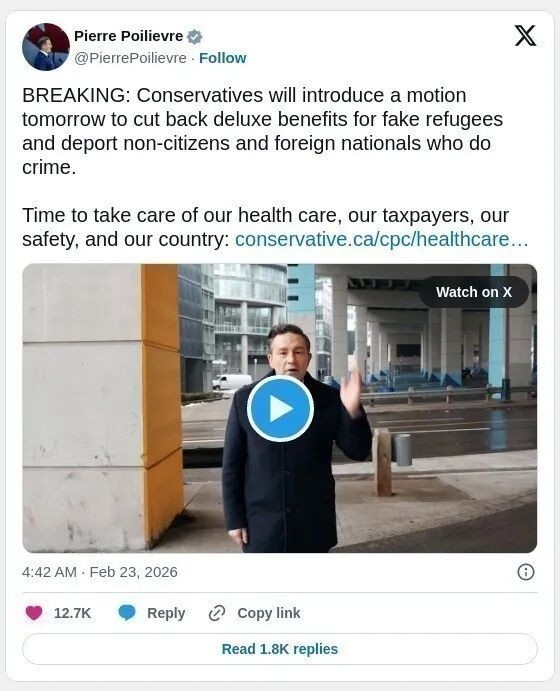 保守党领袖博励治(Pierre Poilievre)已经在社交媒体上对动议的部分内容进行了预告。博励治称,保守党将于明日提出一项动议,削减假难民的豪华福利,并将犯罪的非公民和外国国民驱逐出境。