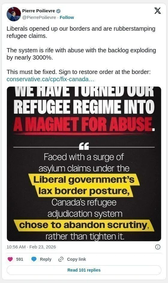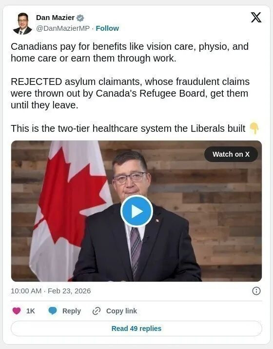 他在另一篇帖子中批评即使是被加拿大难民委员会驳回的庇护申请者(其申请系欺诈性质),仍能获得视力保健、理疗和家庭护理等福利,