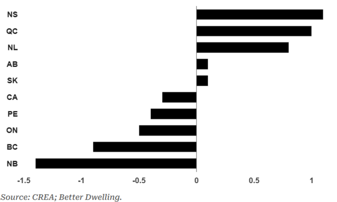 新斯科舍省是另外一个出现明显上涨的省份,房价上涨1.1%(+4,400加元)至417,700加元。这一增长是在12月异常大幅下跌之后出现的,收复了大约三分之一的跌幅。这更像是一次“死猫反弹”,而不是趋势逆转,但新的刺激政策可能会迅速改变市场。