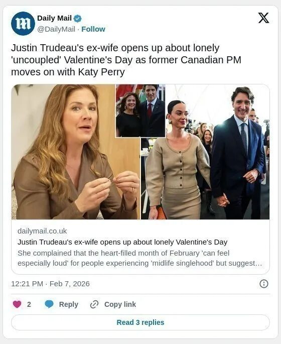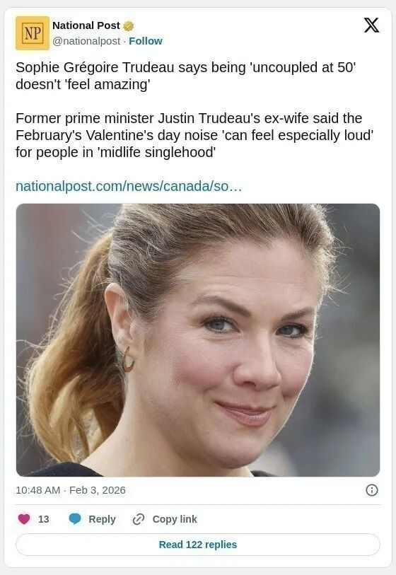加拿大前总理贾斯廷·特鲁多(Justin Trudeau)与美国流行歌手凯蒂·佩里(Katy Perry)恋情曝光后,其前妻索菲·格雷瓜尔·特鲁多(Sophie Grégoire Trudeau)则在情人节前夕公开谈起自己单身的生活。