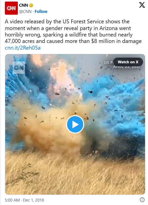 2018年,美国林务局公布的一段视频显示,亚利桑那州一场性别揭晓派对发生严重事故,引发山火,烧毁近4.7万英亩土地,造成超过800万美元的损失。