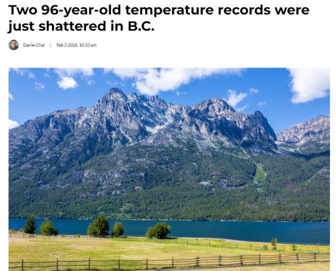 根据加拿大环境与气候变化部(ECCC)发布的数据,截至 2 月 4 日晚上 11:11,BC 省至少 15 个地区刷新或追平当日历史高温纪录。