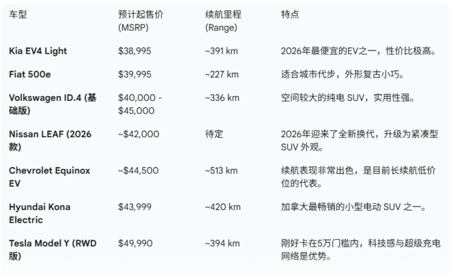以下是目前加拿大市场上起售价在5万加元以下的主流纯电动车型(BEV):