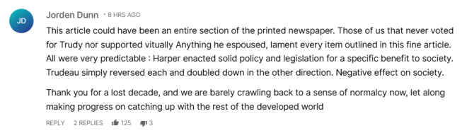 “这篇文章完全可以作为报纸的一整版内容。我们这些从未投票给特鲁多,也从未支持他任何主张的人,对于文章中列举的每一项政策都感到惋惜——完全在意料之中:哈珀推行的是稳健的政策和立法,旨在给社会带来具体利益;而特鲁多则逐一推翻,并在相反方向上加码,对社会造成负面影响。