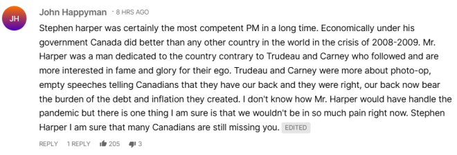 “哈珀无疑是近年来最称职的总理。在他的领导下,加拿大在 2008-2009 年全球金融危机中经济表现优于世界上任何其他国家。哈珀先生全心全意为国家奉献,与特鲁多和卡尼形成鲜明对比——后两者更多追求名声和个人光环。特鲁多和卡尼注重拍照留念、空洞演讲,不断告诉加拿大人‘我们会支持你们’,可如今,我们却承担着他们留下的债务与通胀后果。我无法断言哈珀若在疫情期间执政会如何应对,但有一点我可以确定:现如今,我们绝不会陷入如此困境。斯蒂芬·哈珀,许多加拿大人至今仍在怀念您。”