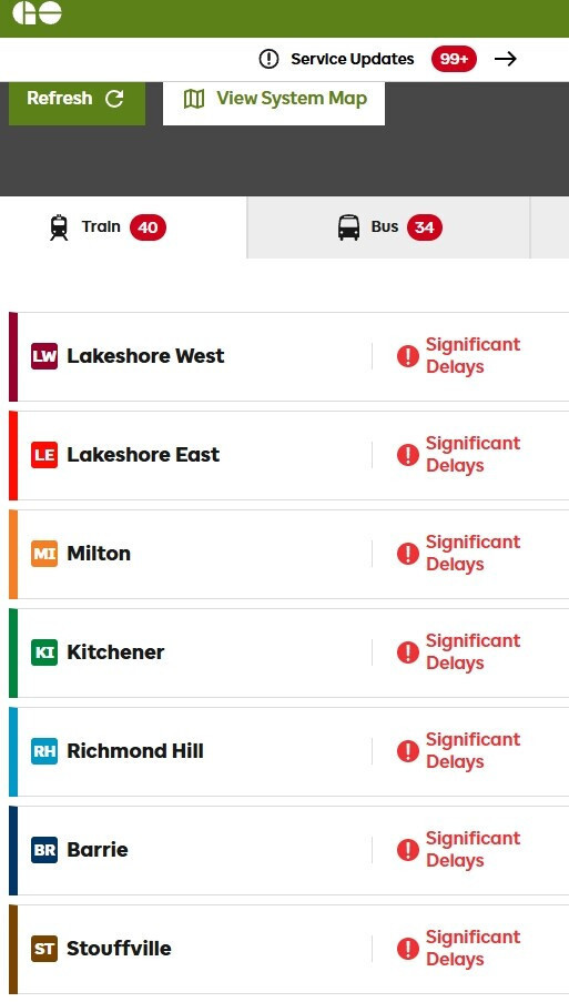 根据GO官网信息,所有7条通往Union Station的火车线均出现严重延误: