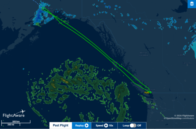 根据 FlightAware 数据显示,该航班由空中客车 A330-300 执飞,于凌晨2点19分从温哥华国际机场起飞,并在上午8点10分再次降落,8点21分回到登机口。也就是说,乘客在空中飞行整整6个小时后,最终回到了出发地。