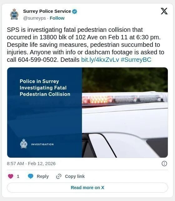警方表示:“素里警察局一线警员与素里消防局和BC省紧急医疗服务队一同赶到现场。尽管采取了急救措施,但这位45岁的女性行人不幸因伤势过重身亡”。