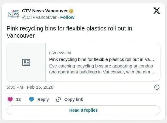 非营利机构Recycle BC表示,软塑料此前只在回收站点接受投放。如今,凡是在温哥华使用Recycle BC回收服务的公寓和共管公寓楼,居民都可以在自家楼内使用粉色回收箱。该机构称,目前约有4,500个粉色回收车(carts)正在陆续投放。