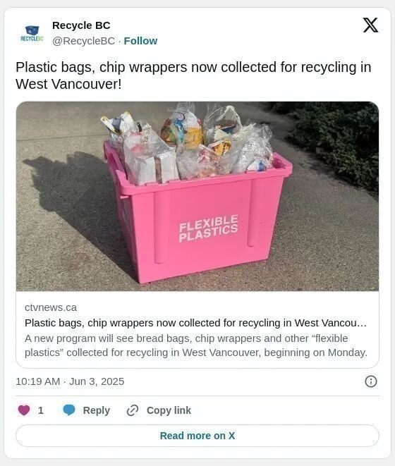 Recycle BC表示,目标是在2027年前实现50%的软塑料回收率。目前,该机构已在West Vancouver及Maple Ridge的公寓和独立住宅中收集软塑料。