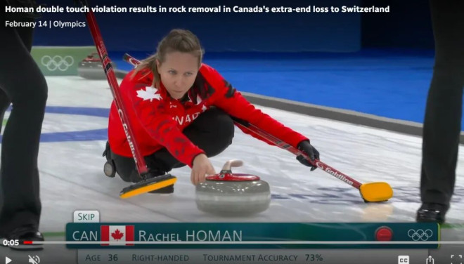 周六,加拿大男队5比9不敌瑞士队,战绩变为3胜1负。同一天,女子赛场也爆出类似风波。加拿大名将 Rachel Homan 在对阵瑞士队时,其第一壶被裁判判定“双触”,直接移出比赛。她在场上当即否认:“百分之零的可能,我从来没做过这种事。”最终加拿大队在加局中7比8惜败,战绩跌至1胜3负,晋级形势变得被动。