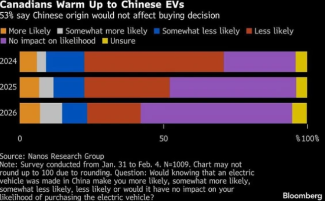 相比2024年,这一态度变化相当明显。当时有61%的加拿大人表示,他们不太可能购买中国电动车;只有25%的人表示不会影响决定;仅9%的人表示,如果是中国制造,反而更愿意购买。