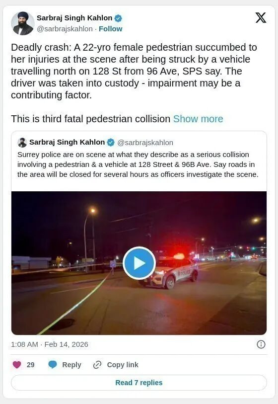 据警方消息,周五晚在素里Cedar Hills社区,一名行人在被车辆撞击后不幸死亡。