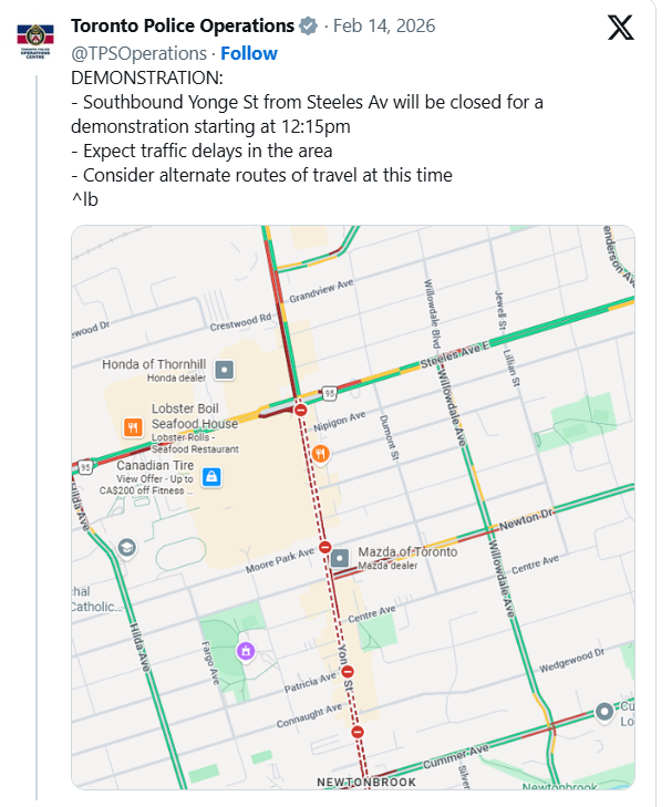 Yonge Street从Steeles至Sheppard Avenue路段将实施封路,其中Steeles至North York Boulevard之间将于上午11点至下午5点完全封闭。警方敦促居民及通勤人士尽量避开该区域,因参与人数“可能超过”20万。