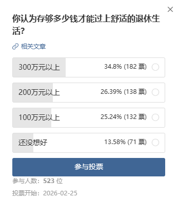 在51网友的投票调查中(500多人参与),也有近35%的人认为,需要存够300万才能过上舒适的退休生活。