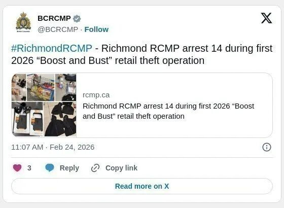 “这些有针对性的行动体现了情报主导型警务和与当地零售商建立牢固伙伴关系的重要性”,列治文皇家骑警督察瓦兹·卡萨姆(Vaz Kassam)在声明中表示,“零售盗窃影响着商家、员工和整个社区。通过共同努力,我们可以打击这种犯罪活动,并帮助维护列治文所有居民、工作者和购物者的安全环境”。