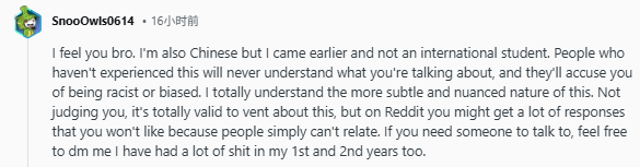 “我懂你,我也是中国人,但来得比较早,也不是留学生。没经历过这种事的人,是无法真正明白你在说什么的,他们只会指责你是种族歧视或者有偏见。我完全理解这里面那种更微妙、更复杂的感受。”