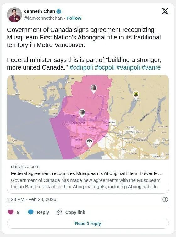 简单来说,这意味着联邦政府正式承认穆斯克姆在其传统领土内享有原住民权利(包括土地所有权),并承诺逐步落实这些权利。该协议为穆斯克姆在大温地区土地和水域的决策权建立了结构化框架。