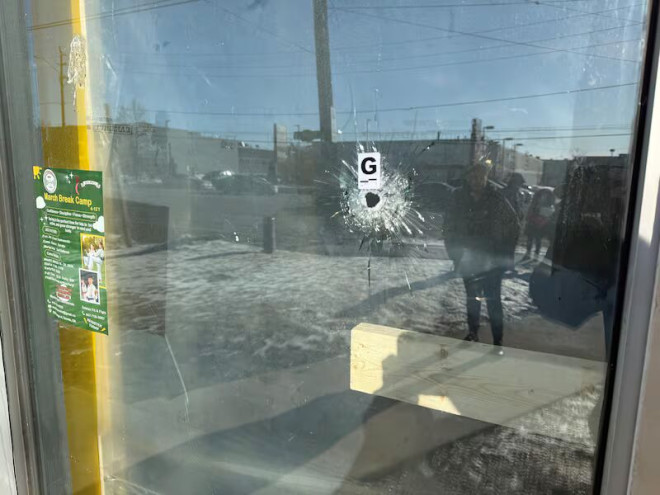 视频显示,位于央街7027号(Steeles Avenue以北)的Saliwan拳击馆正门布满弹孔,玻璃也被打碎。