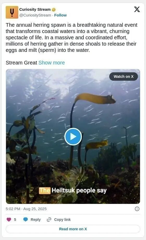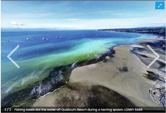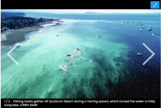 每年春季,加拿大BC省海岸都会上演一场规模惊人的自然奇观——鲱鱼(herring)大规模产卵。数以十亿计的鱼卵、数以百万计的鱼群,将原本深蓝色的海水染成乳白色或碧绿色,海水呈现出热带般的色彩,场面之壮观甚至可在太空中观测到。