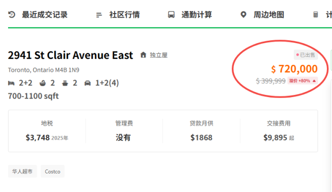 根据51找房数据显示,这套独立屋位于多伦多2941 St Clair Avenue East,去年4月以95万的价格上市,后降价到88.8万,一直没有卖掉。