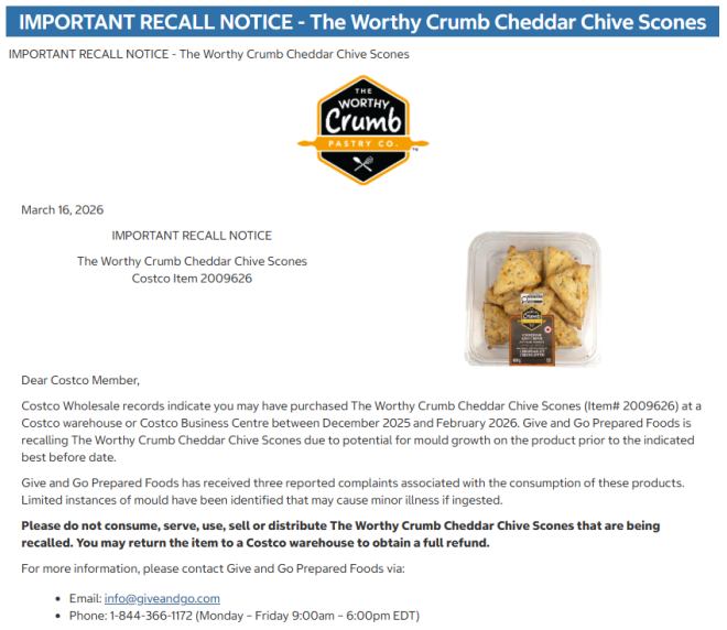 3月16日,加拿大Costco转发了生产商Give and Go Prepared Foods的一则公告,提醒顾客:由于可能存在发霉风险,一款热门烘焙产品正在被召回。