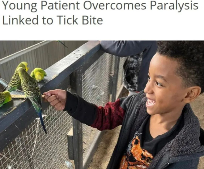 当时医生已经在考虑是否要上呼吸机了,结果孩子妈妈无意中发现他后颈发际线下有个“像玉米粒一样”的东西——其实也是一只吸饱血的蜱虫。移除之后,症状同样迅速逆转。