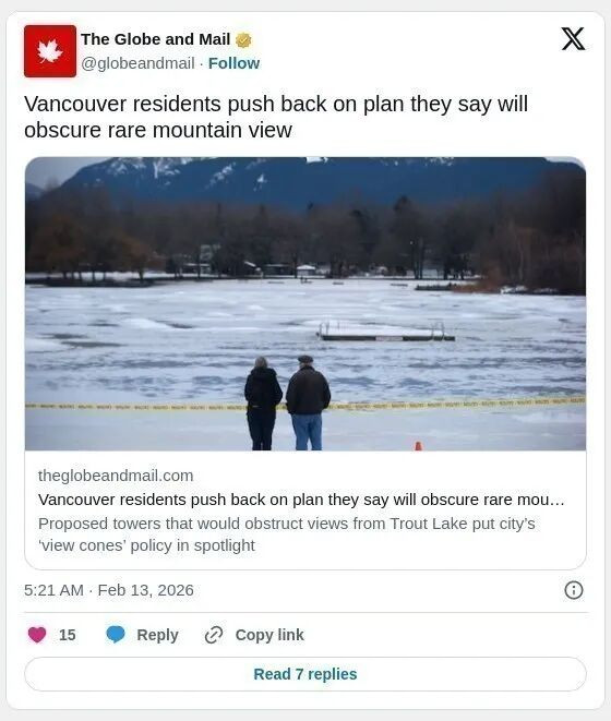 居民和电脑图形专家斯蒂芬·博胡斯(Stephen Bohus)还制作了一张视图模拟图,显示若计划中的高层建筑建成后,鳟鱼湖的山景将被遮挡。拟建建筑包括Victoria Drive 2611号的26层租赁楼,以及East Broadway 1926-1978号的33层租赁楼。