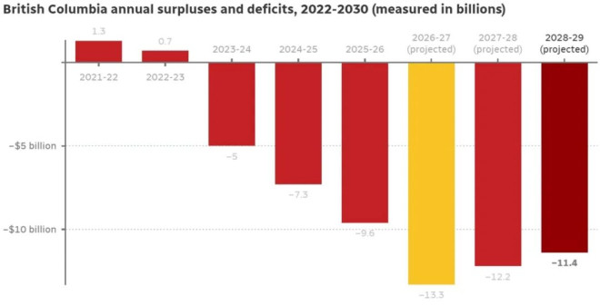 BC省的债务规模,正在用一种肉眼可见的速度往上蹿:从2025/26财年的1540亿,涨到2026/27年的1834亿;2027/28年破2000亿;到2028/29年,直接冲到2346亿加元。