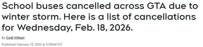 受风暴的影响,今早6点前,大多伦多及汉密尔顿地区(GTHA)的教育局已宣布2月18日的校车服务取消,学校仍保持开放。