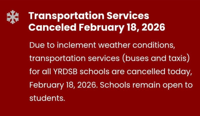 约克区公校教育局(YRDSB)和约克区天主教教育局均表示,今天校车取消,但学校照常对学生开放。