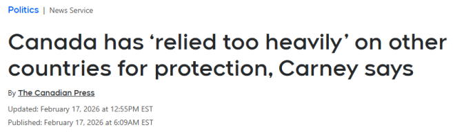 “加拿大绝不应在自身安全问题上受制于其他国家,长期以来过度依赖地理位置和盟友的保护。”加拿大总理卡尼(Mark Carney)在今天的新闻发布会上说道。