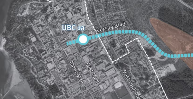 TransLink 于 2022 年 4 月发布的 UBC 天车推荐路线和站点位置。(TransLink)