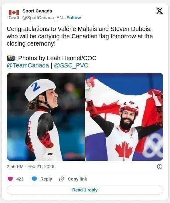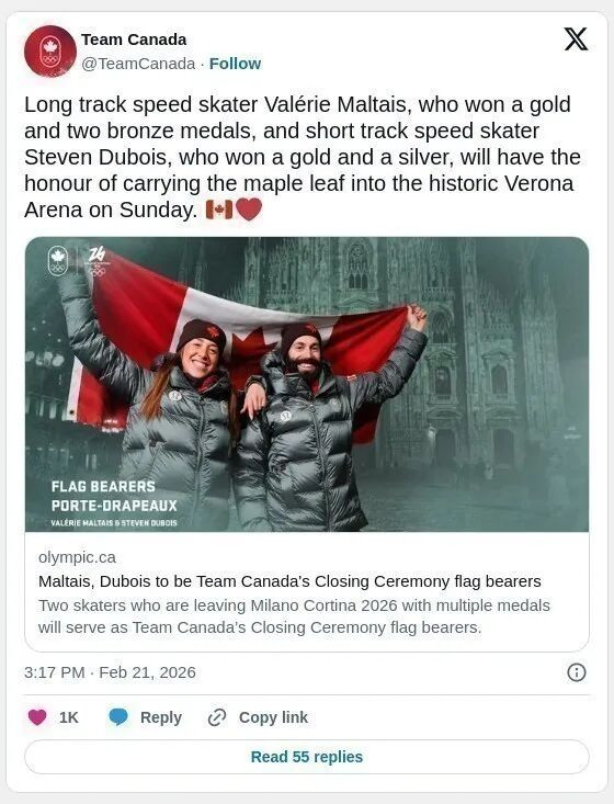 今日举行的2026年奥运会闭幕式上,加拿大速滑运动员瓦莱丽·马尔泰斯(Valérie Maltais)和短道速滑运动员史蒂文·杜波依斯(Steven Dubois),在奥运会闭幕式上担任加拿大代表团旗手。