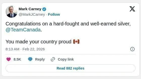 周日,加拿大男子冰球队在加时赛中以 1-2 负于美国队后,总理马克·卡尼对加拿大队表示赞扬。