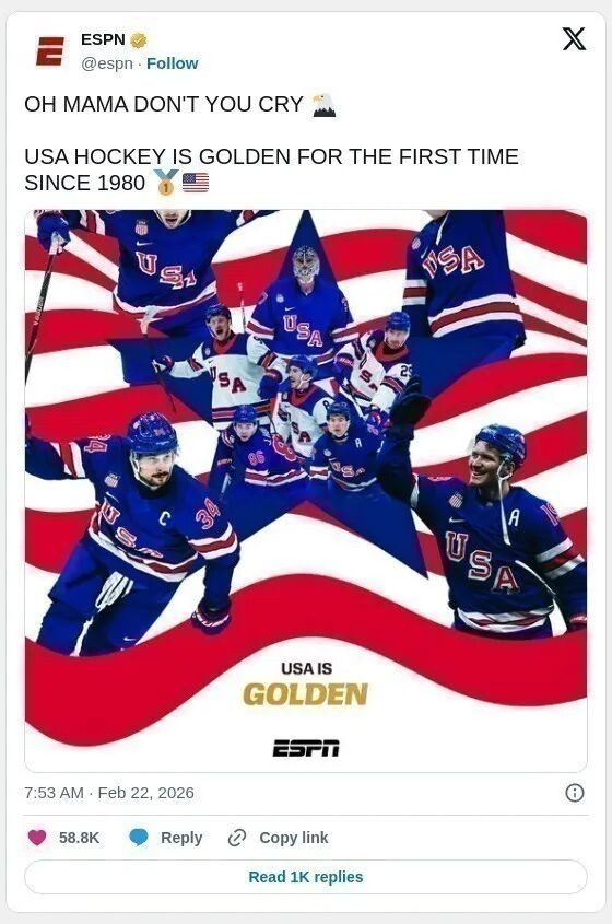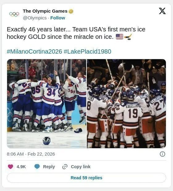 美国总统唐纳德·特朗普在 Truth Social 上分享了一篇帖子,庆祝美国在 2026 年冬季奥运会男子冰球比赛中战胜加拿大夺得金牌。