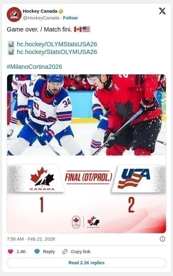 加拿大自 2002 年以来第四次闯入男子冰球金牌争夺战,但自 1998 年 NHL 球员获准参加奥运会以来,他们首次只能屈居亚军。