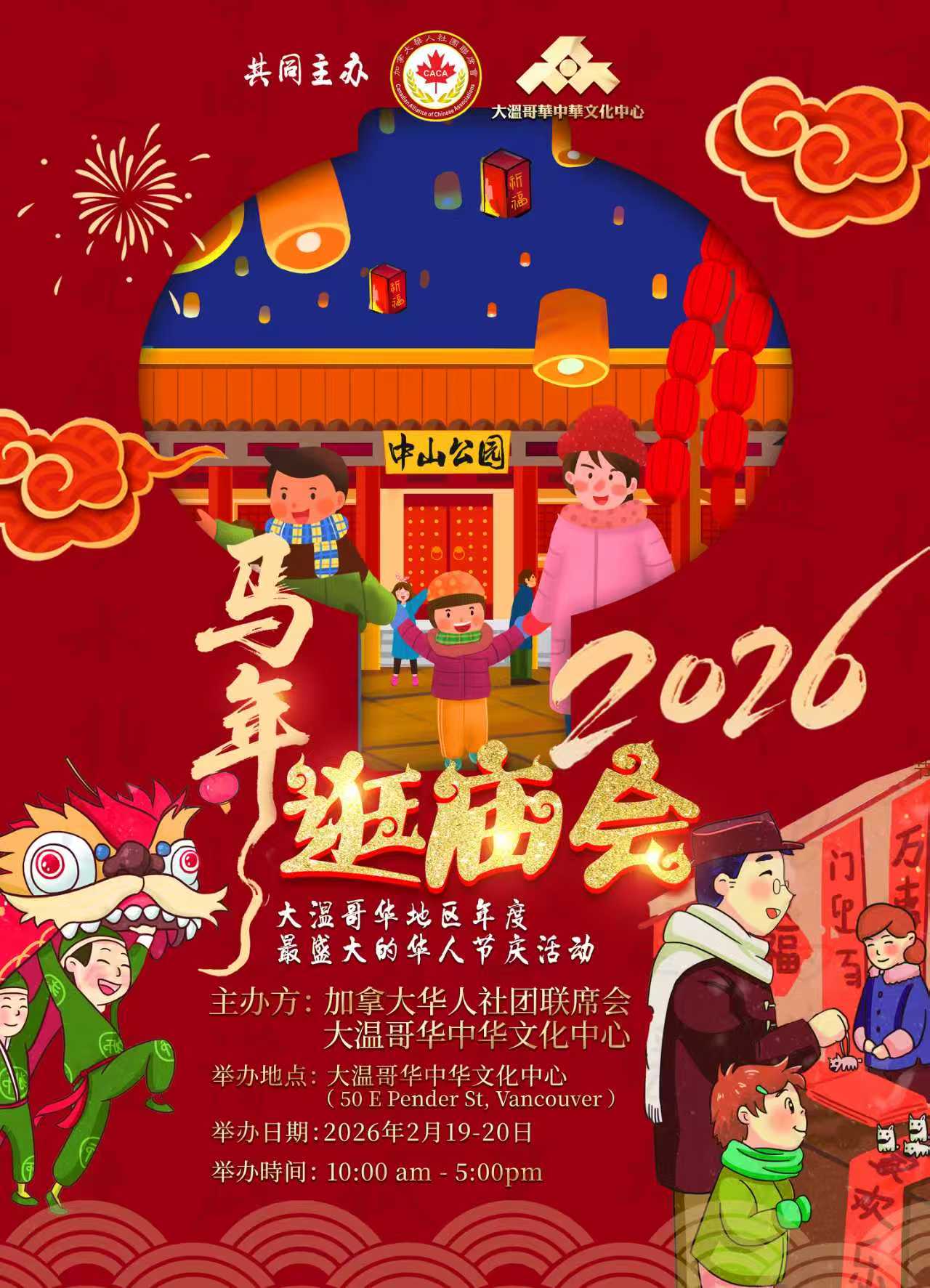 本届新春庙会由加拿大华人社团联席会与大温哥华中华文化中心联合主办,活动地点设于温哥华唐人街核心地标——大温哥华中华文化中心。主办方表示,希望通过庙会这一深受社区欢迎的传统形式,弘扬中华优秀传统文化,凝聚社区力量,并推动多元文化交流与共融。