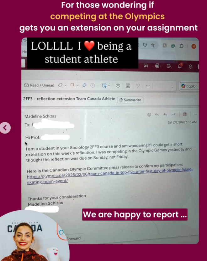 加拿大花样滑冰选手 Madeline Schizas 这两天在米兰冬奥会不只是因为比赛上热搜。她是因为——给大学教授发了一封“请作业延期”的邮件。
