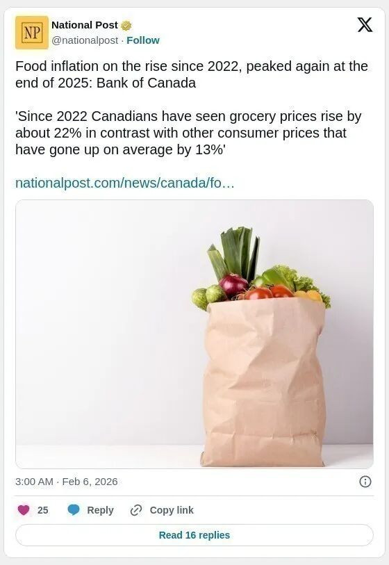 根据《国家邮报》的报道,加拿大央行经济分析部高级经济学家 Olga Bilyk 在 2 月发布的一篇题为《理解 2025 年食品通胀回升》的文章中指出,食品通胀在 2025 年 12 月达到 5%,为自 2023 年末以来的最高水平。她表示,食品通胀是经济学家衡量食品价格同比增长的重要指标,并确认 2025 年这一指标“偏高”。