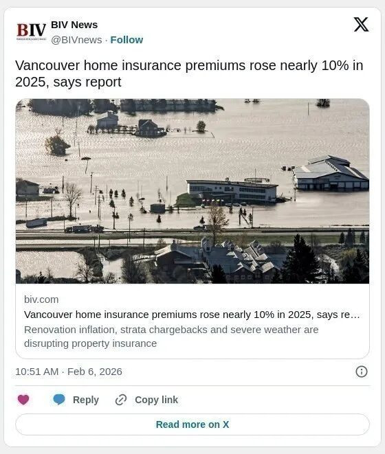 根据总部位于多伦多的保险比价平台 My Choice Financial Inc. 于2 月 3 日发布的报告,温哥华住宅保险保费在 2025 年上涨了 9.94%。报告指出,保费上涨与老化的房屋库存及不断攀升的装修费用密切相关。